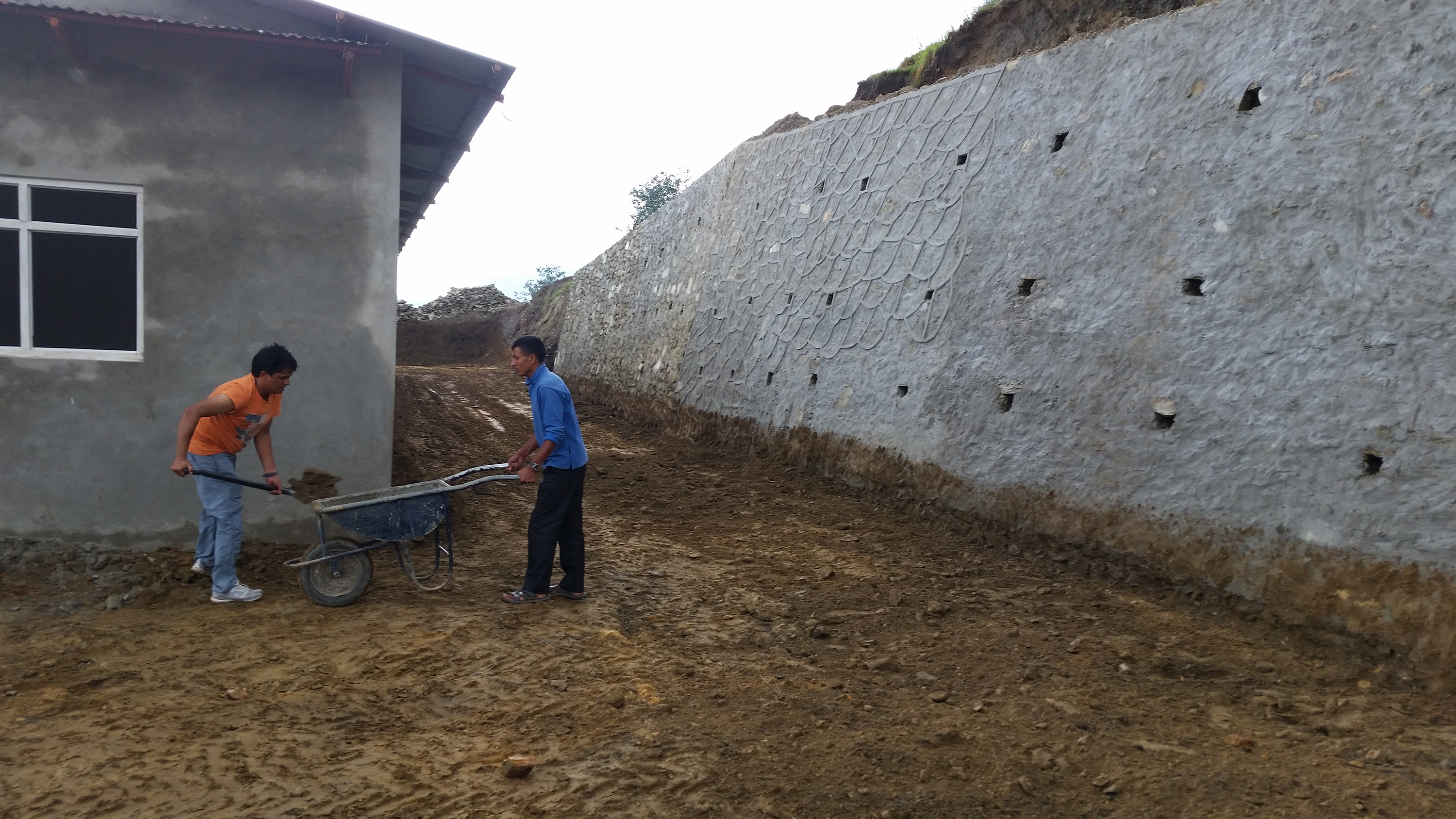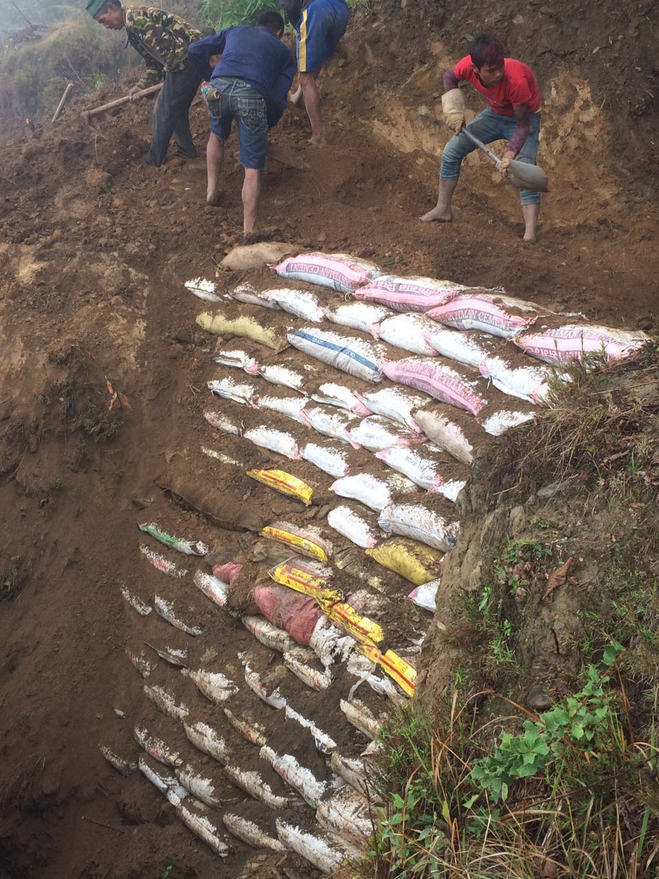 Um jetzt aber auch etwas Positives zu berichten: unser Haus und der Neubau des Personalwohnheims sind nicht betroffen. Wir haben vor zwei Jahren ca. 6.000 Euro für die Sicherung vor solchen Schlammlawinen investiert, diese Investition hat sich jetzt bezahlt gemacht. Das Wohnheim haben wir mit einem System von Erdplastiksäcken geschützt. Die neuen Häuser im Dorf müssten in Zukunft ebenso gesichert werden. Die Bauern haben das System schon während des Baus interessiert studiert und werden da sicher nach logistischer Hilfe fragen.
